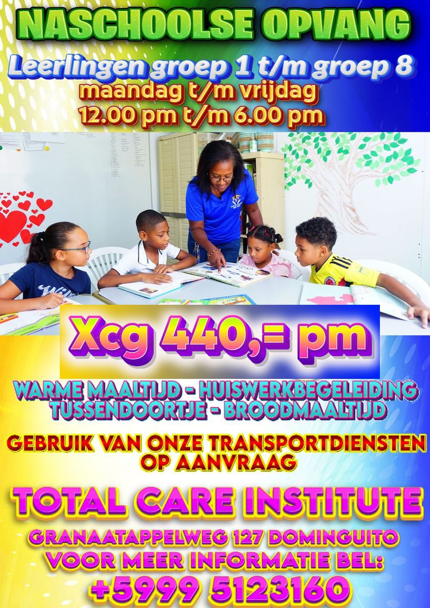 Total Care Institute ta ofresé kuido total na tur mucha ku ta bishitá e orasashon hubenil aki. E kuido pre eskolar i mará na esaki, e kuido despues di skol …